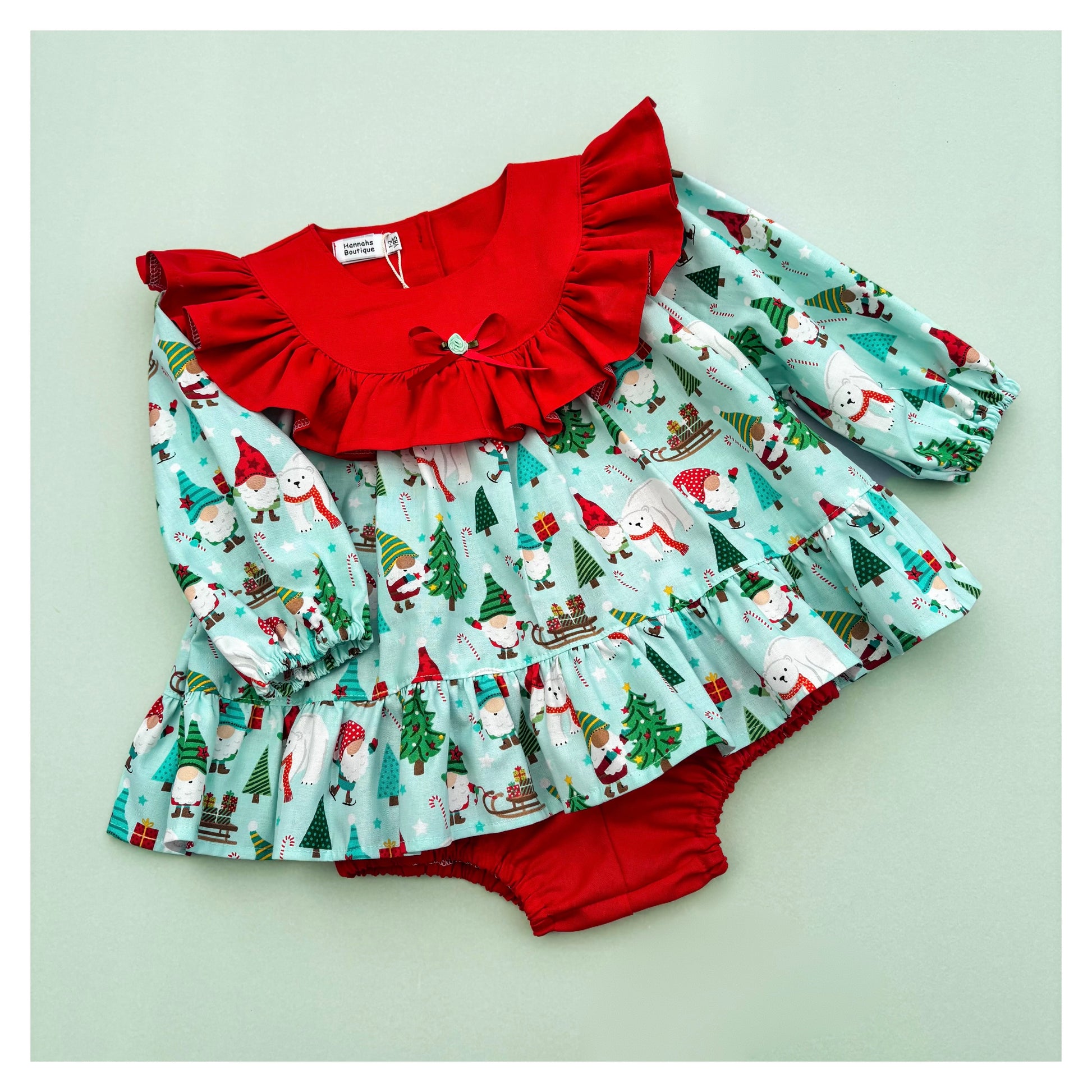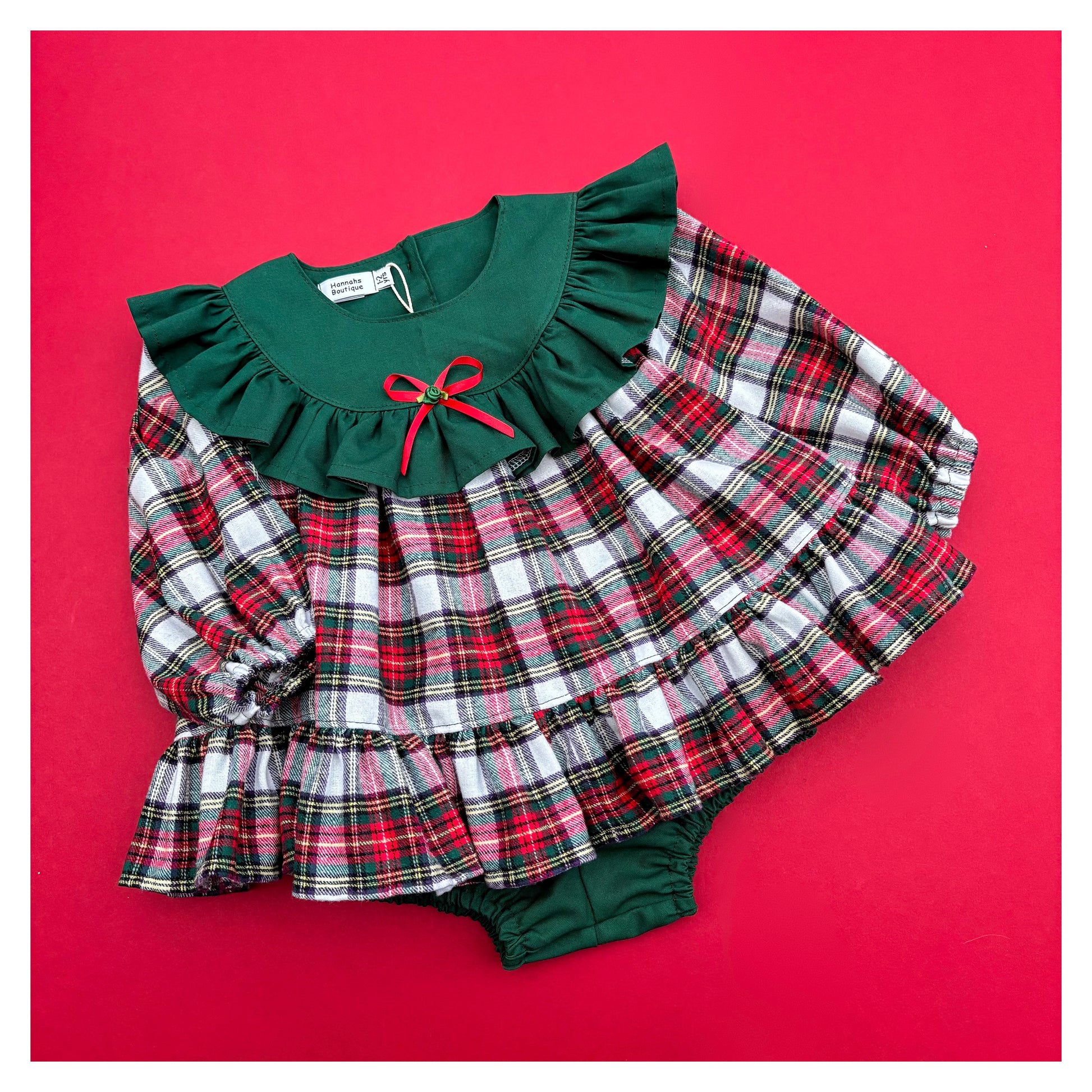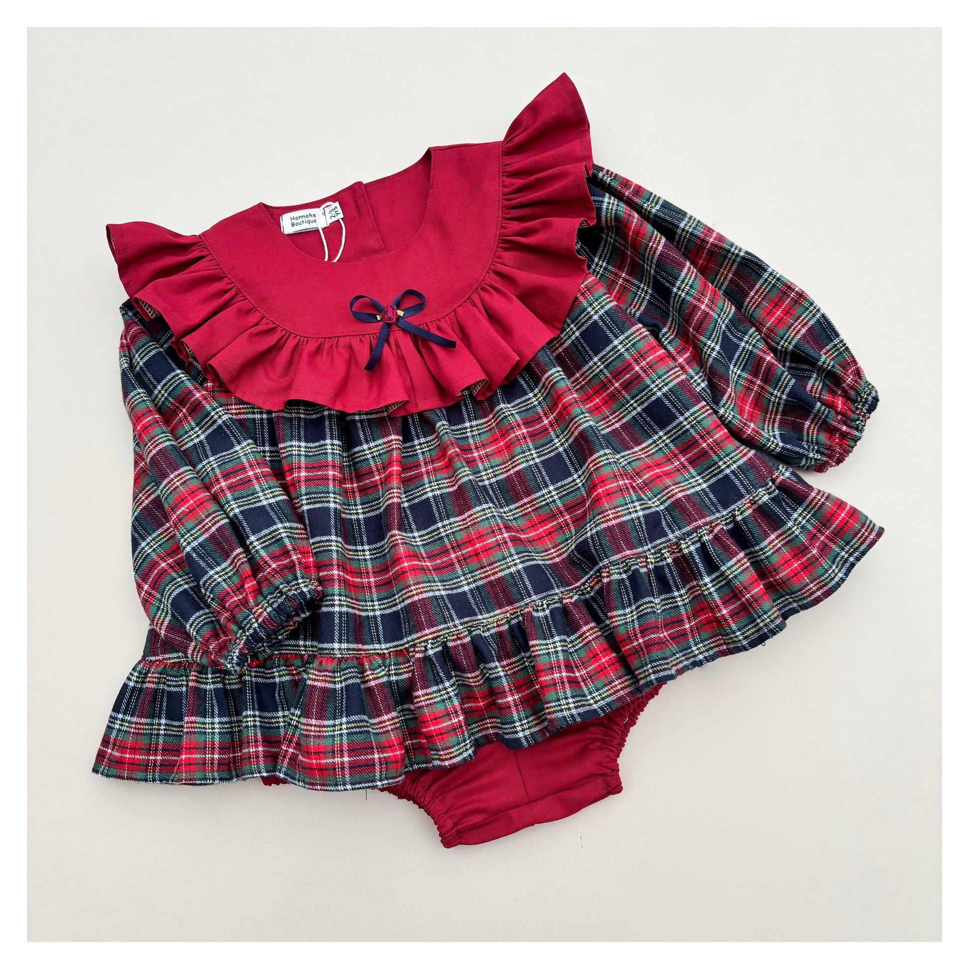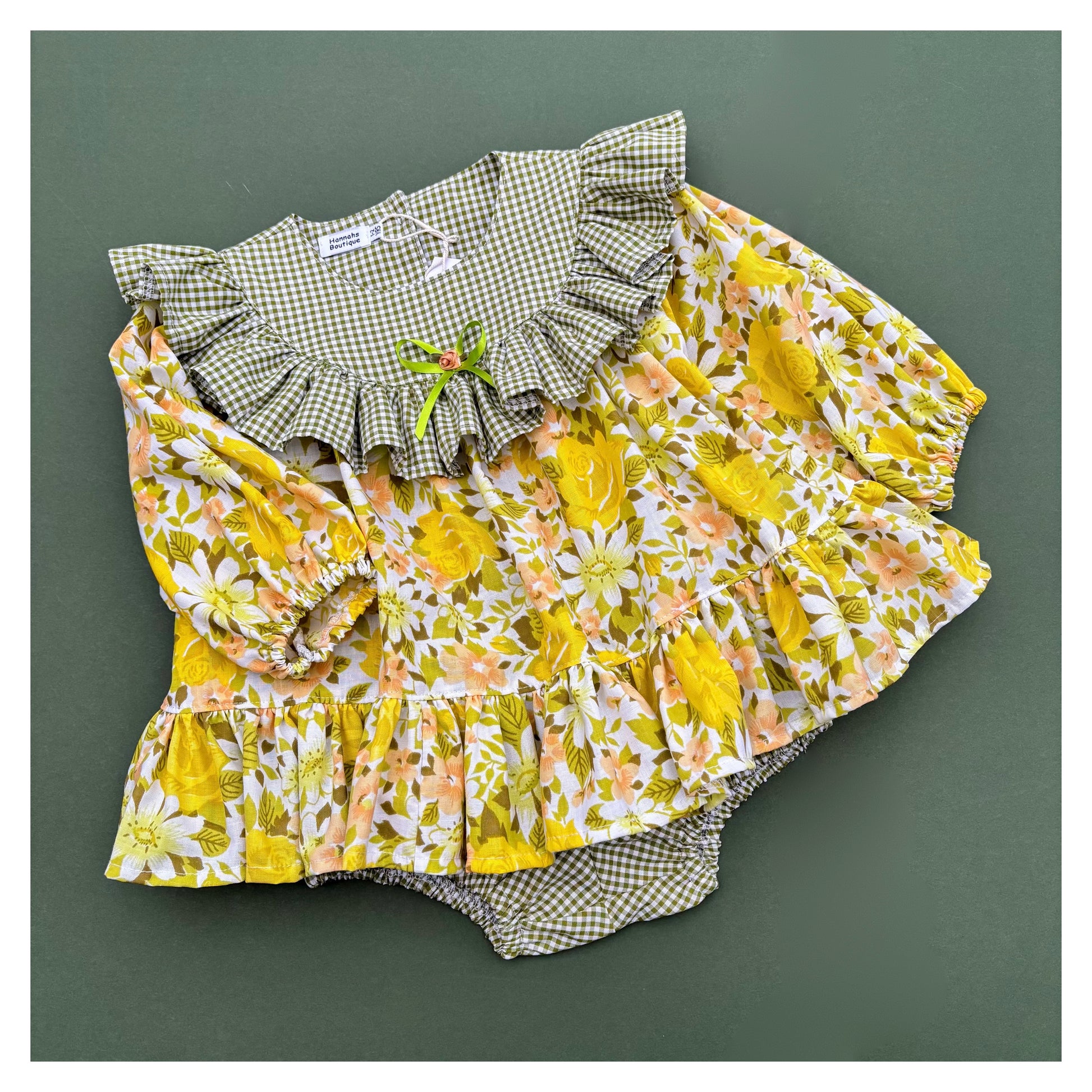 Contrast bib, ruffle and bloomers will be in a coordinating plain or gingham.